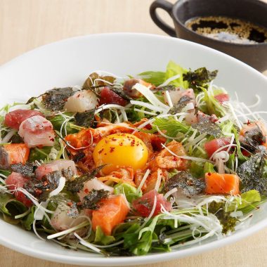 普段あまり野菜を食べない方や野菜がちょっぴり苦手な方におすすめしたいのが、「ユッケ仕立ての海鮮サラダ 」です。3~4人前で1,199円(税込み)、2人前は979円(税込み)です。鮮度の良い海鮮をたっぷりトッピングした食べ応えのあるサラダ。ユッケ仕立てのちょっぴり濃いめのピリ辛ドレッシングが食べやすさをアップさせてくれています。海鮮のカルパッチョ感覚でお召し上がりいただけるサラダです。